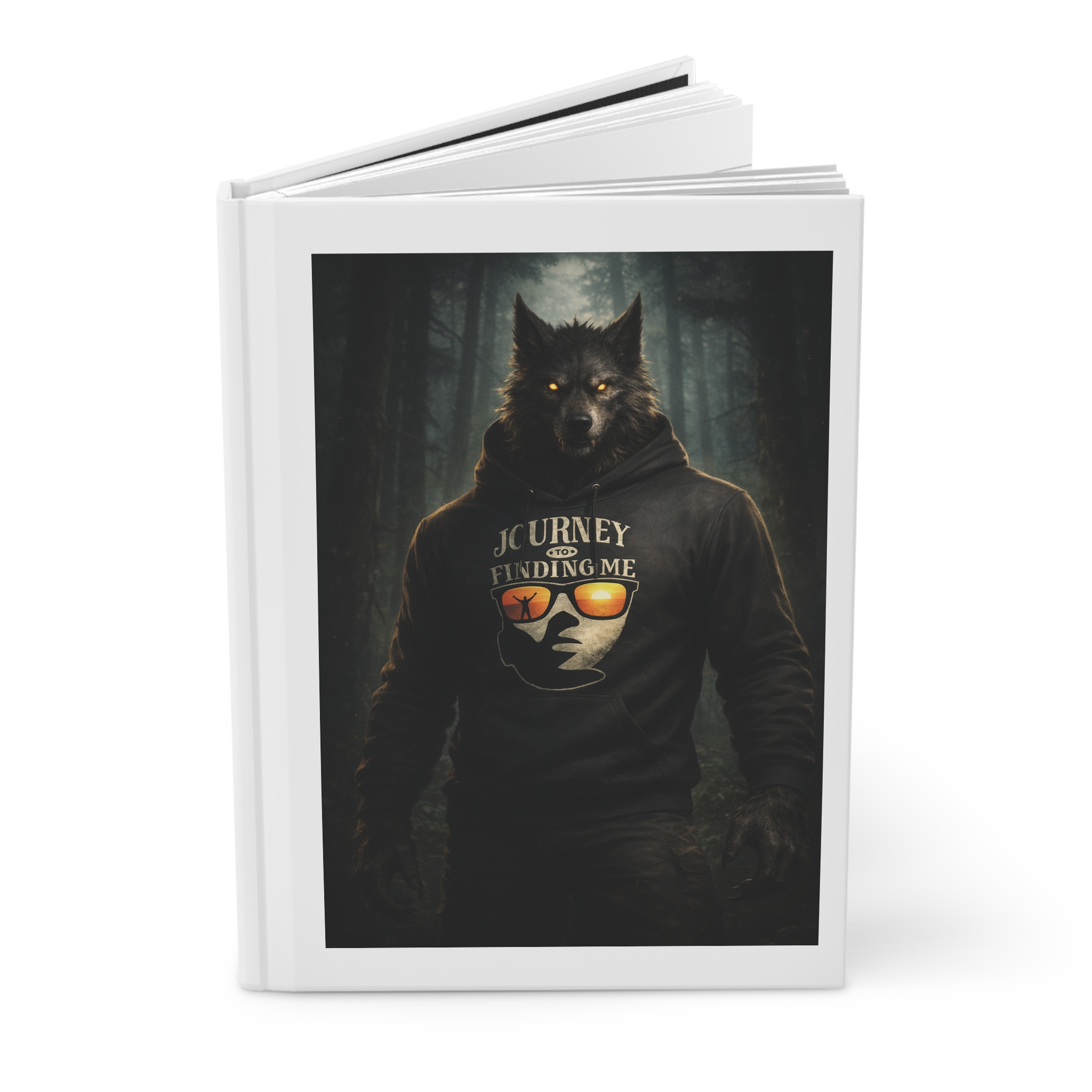 A matte hardcover journal that brings a touch of dark-forest storytelling to everyday notes. The full-wrap illustration shows a wolf-headed figure in a hoodie, bathed in moody woodland light—images that spark introspection, sketching, and late-night plotting. The sewn casewrap binding gives the book a comfortable, flexible lay-flat feel, while the matte-laminated cover keeps the artwork rich and protected from daily wear. Inside are 150 lined pages with perforations for clean removal when you need to share or display a page. Small production barcode on the back cover is the only nod to manufacturing—otherwise this is a compact, visually striking journal made for scribblers who like their stationery with attitude and atmosphere.
